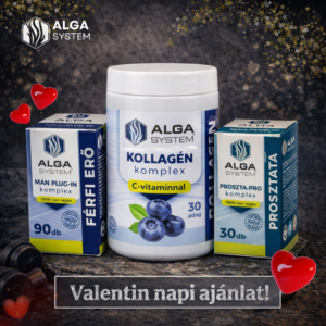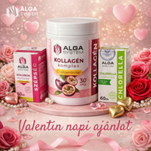 Alga-Vitál Komplex Alga System 60 db-os, vegán étrend-kiegészítő doboz fehér alapon, zöld háttérrel.